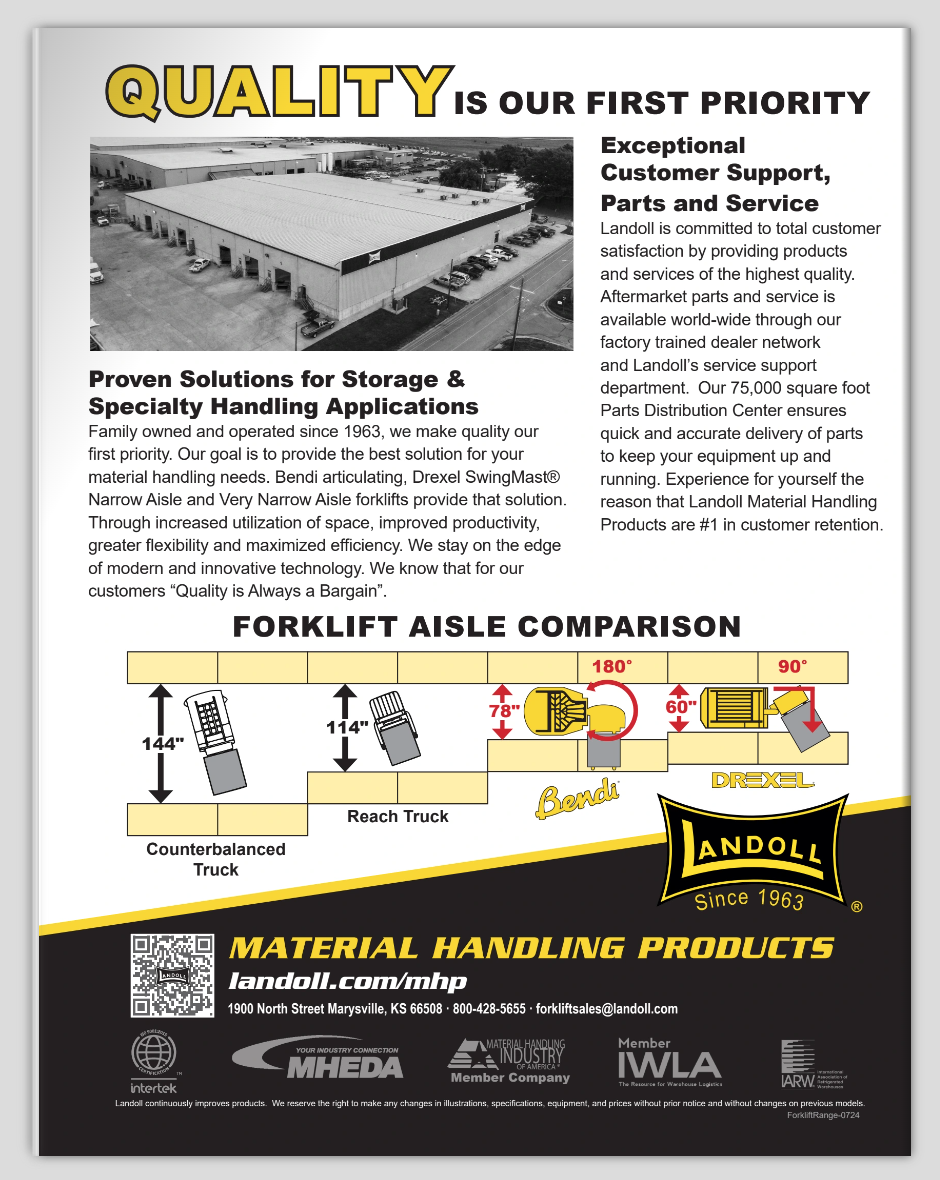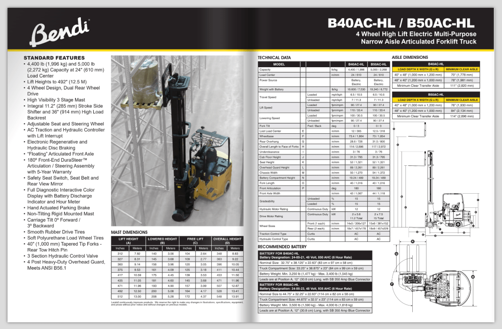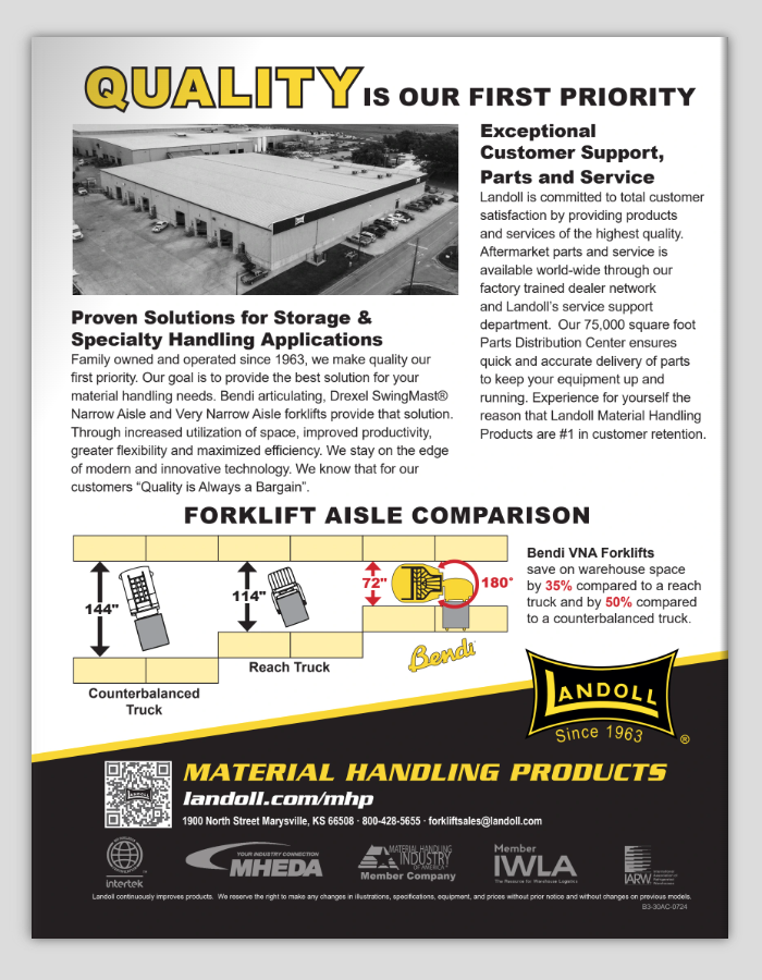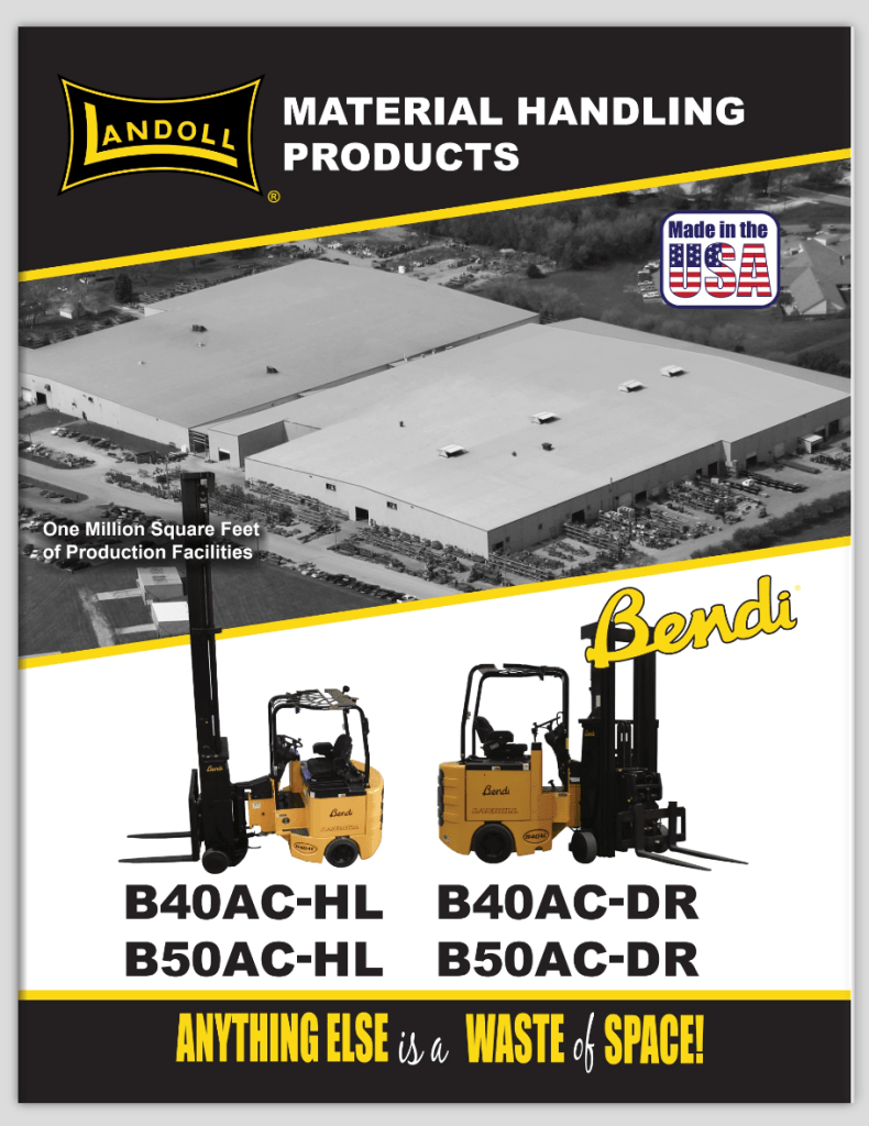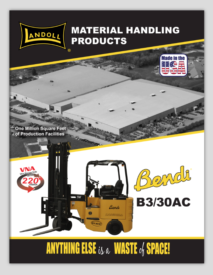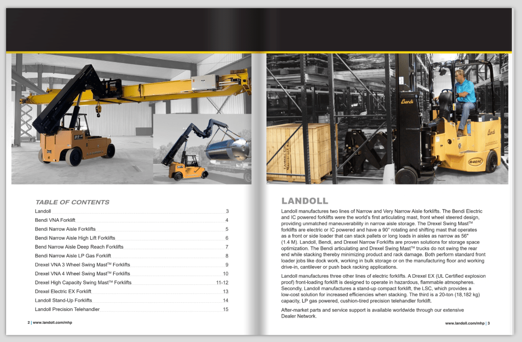Celebrating the company’s anniversary, Landoll’s material handling division desired a fresh look for their product literature. I redesigned the layout for all of Landoll’s forklift literature. They requested multiple angles of forklifts in use, standardized feature lists, line drawings, an emphasis on aisle size, and information on available parts and service.