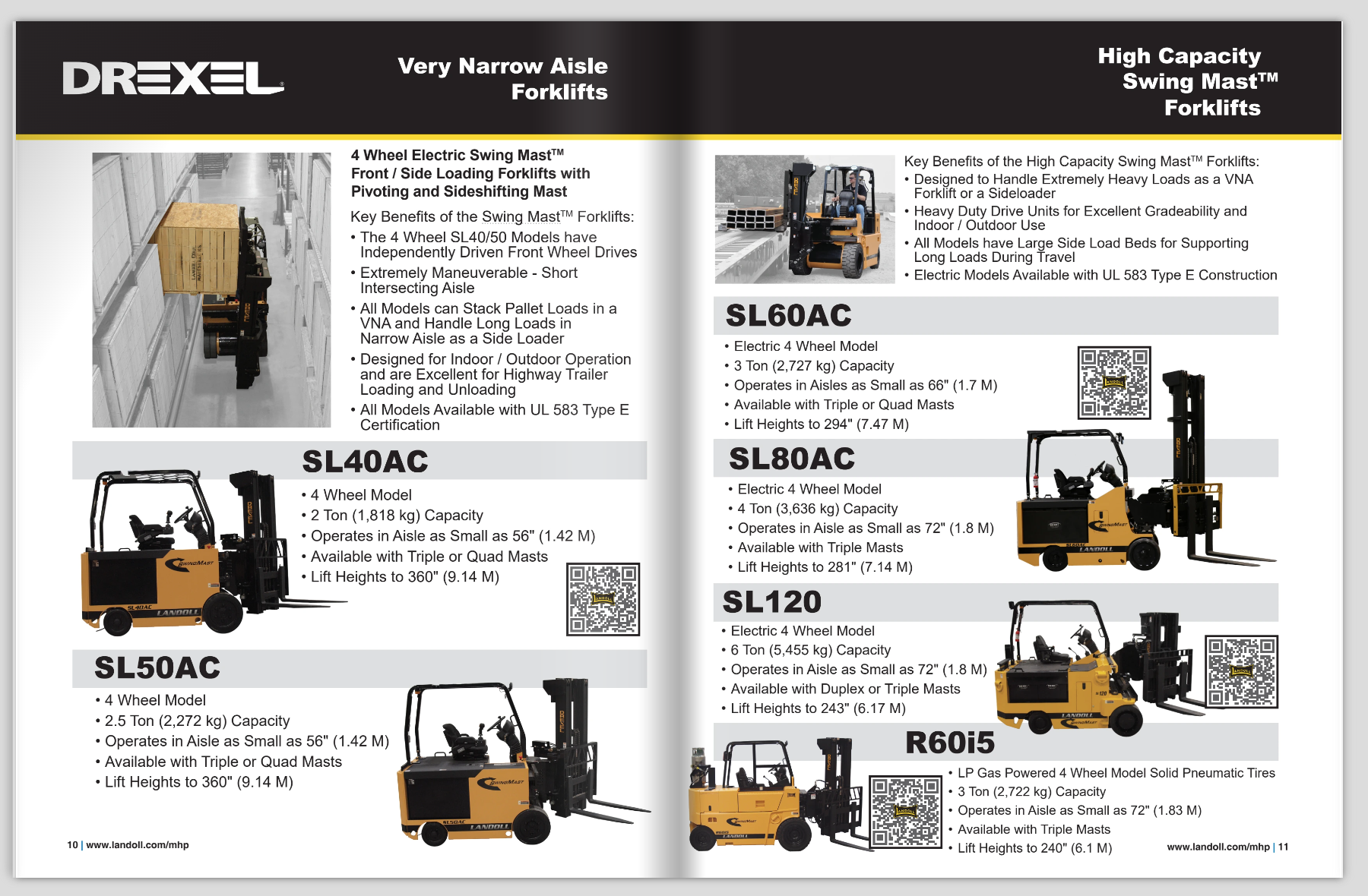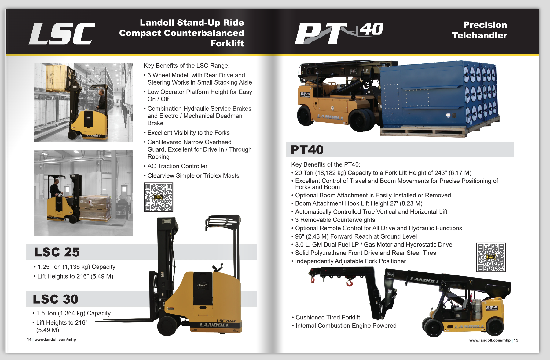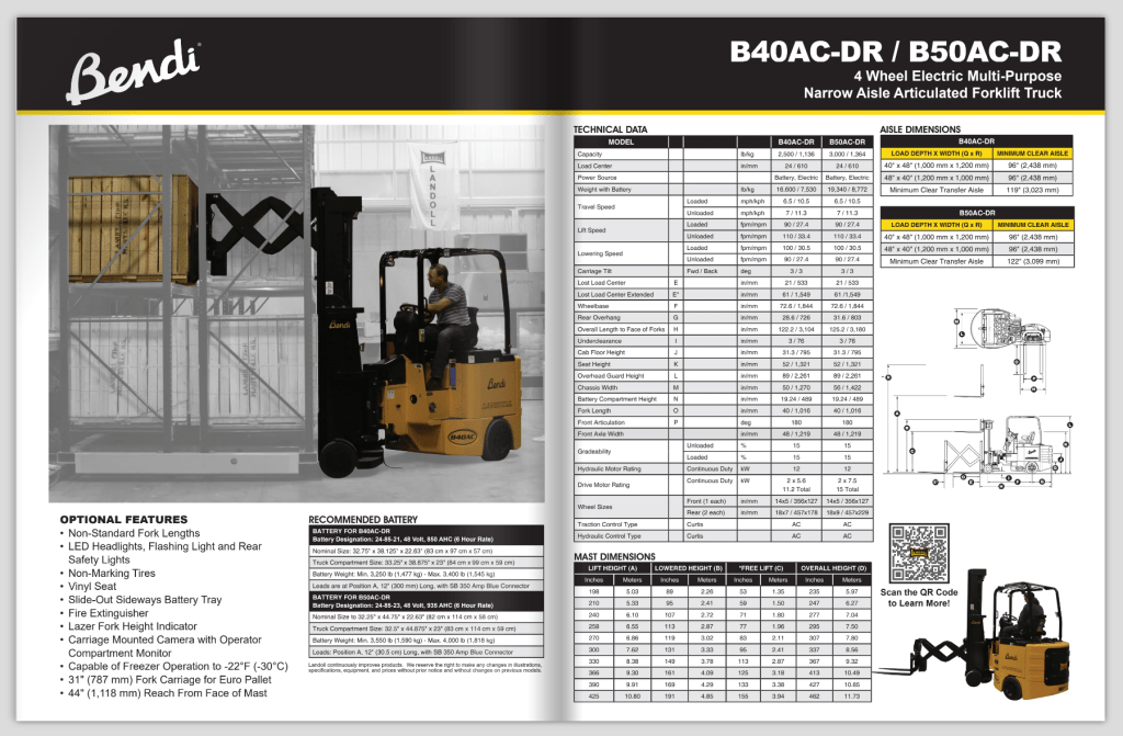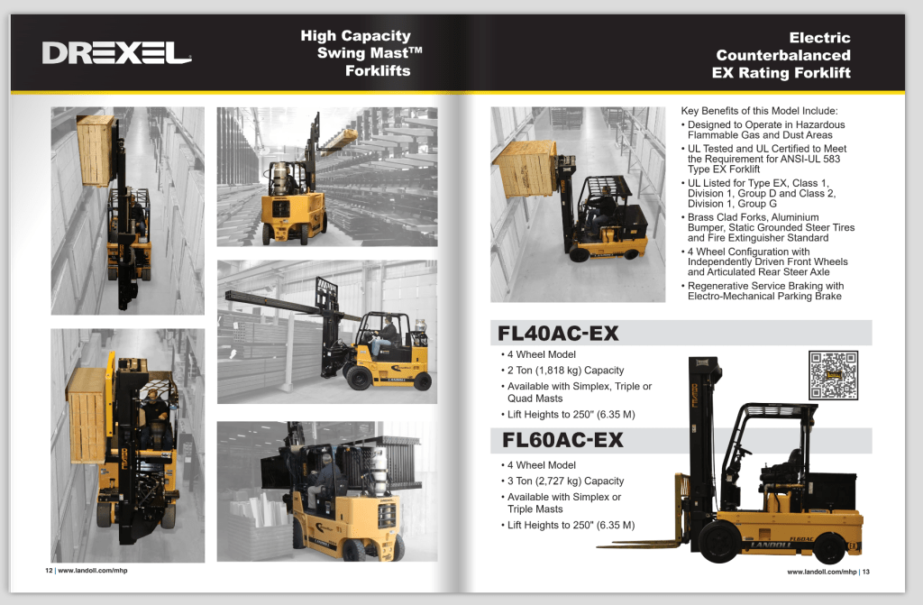Originally, each forklift was displayed on its own 8.5″ x 11″ page. To better include all relevant information, I reformatted the literature as an 11″ x 17″ booklet. Some forklifts were grouped together into one booklet based on shared customer interest, while others were given their own booklet. An additional booklet contains the full range of Landoll forklifts. Each forklift has a brief overview and a QR code linking to the forklift’s webpage.