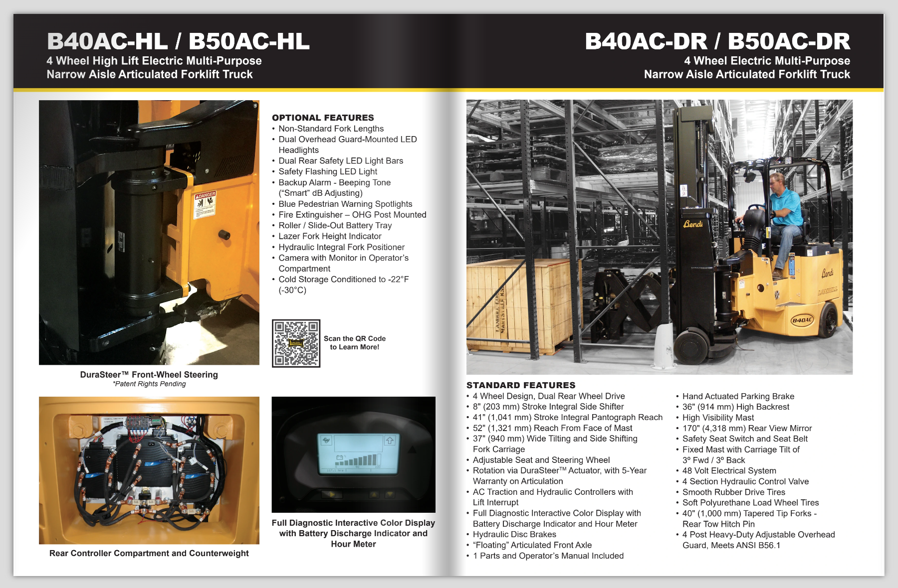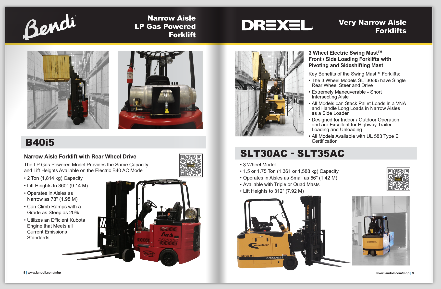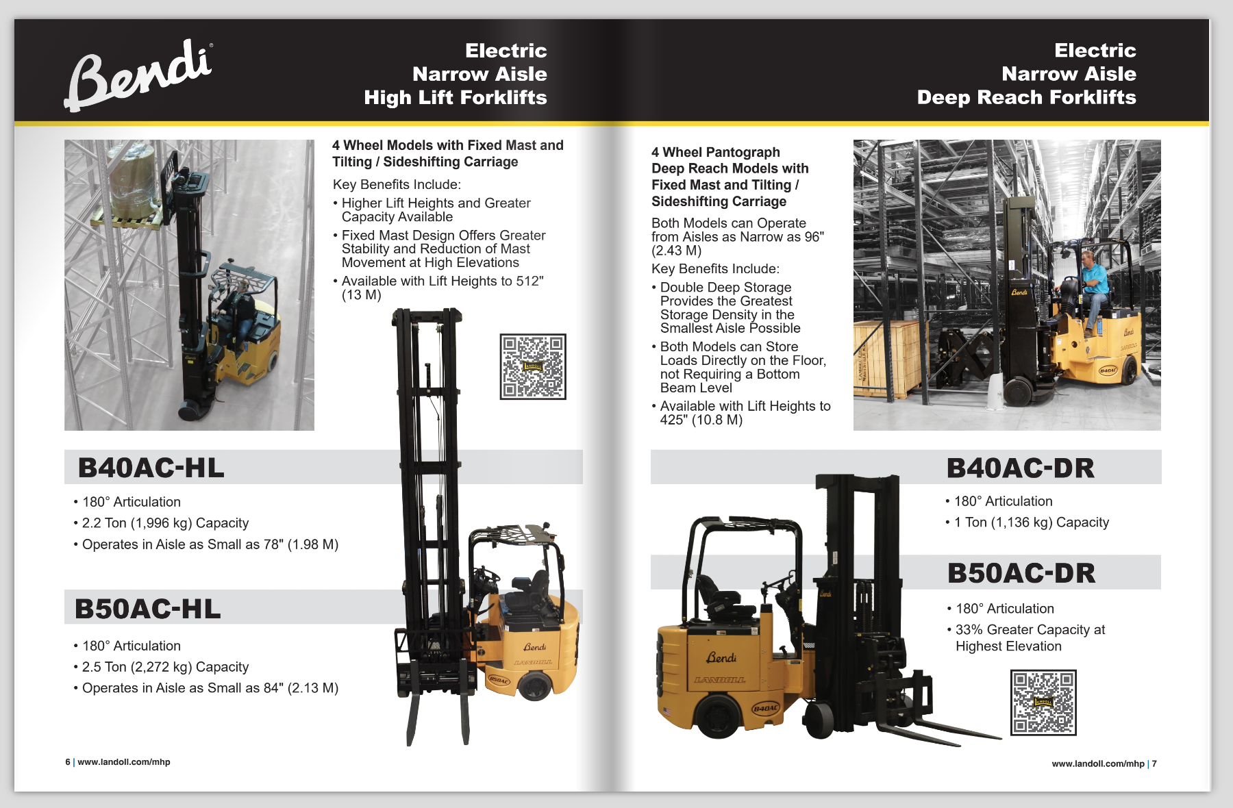 Originally, each forklift was displayed on its own 8.5″ x 11″ page. To better include all relevant information, I reformatted the literature as an 11″ x 17″ booklet. Some forklifts were grouped together into one booklet based on shared customer interest, while others were given their own booklet. An additional booklet contains the full range of Landoll forklifts. Each forklift has a brief overview and a QR code linking to the forklift’s webpage.